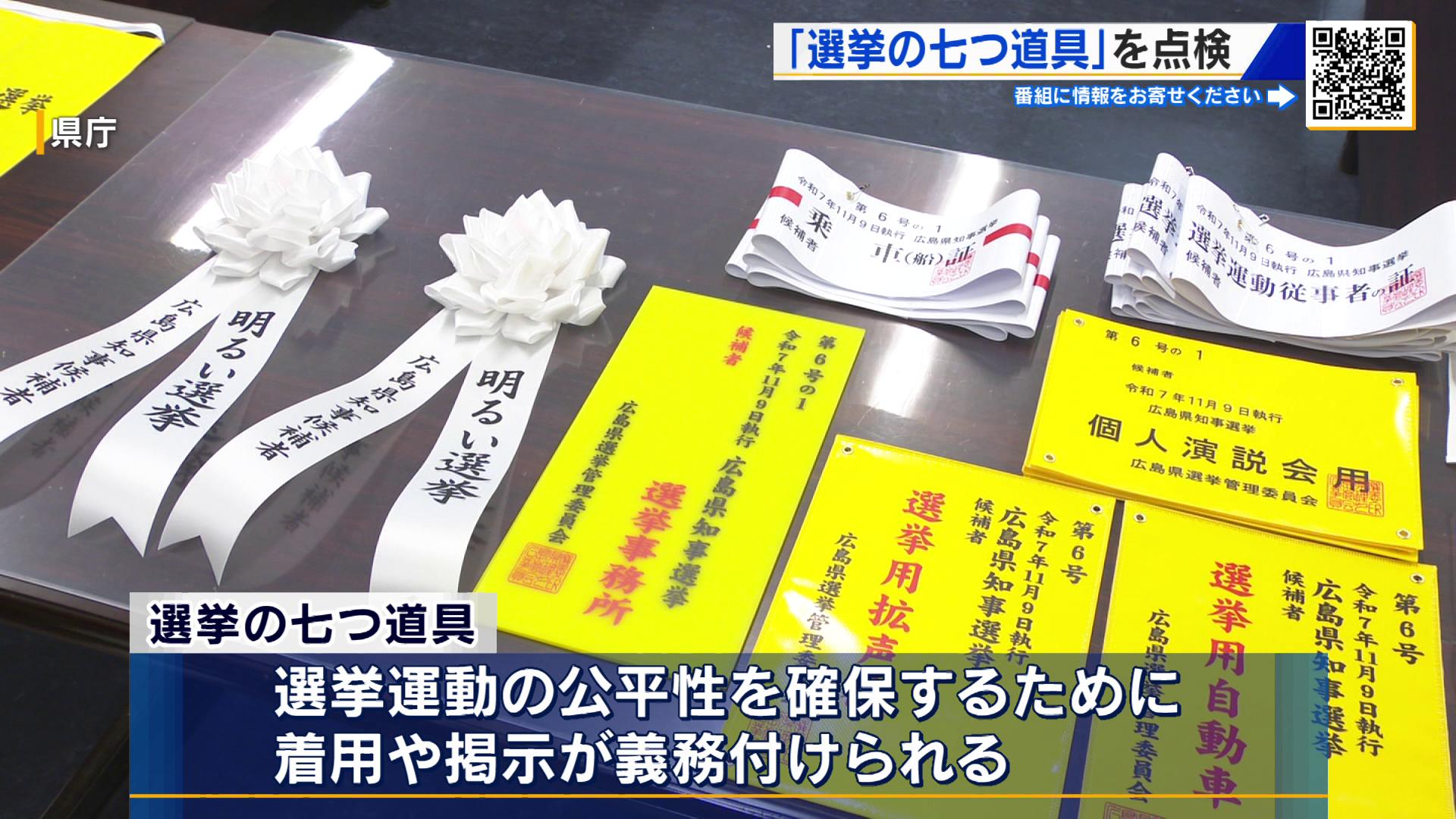 「選挙の七つ道具」は選挙運動の公平性を確保するために着用や掲示が義務付けられているもので、選挙カーの表示板や街頭演説用の旗などが含まれています。