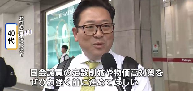 「ネットのライブ中継を見ていました。憲政史上初の女性ということで、注目はしていたので、一回で選出されたということで頑張ってほしい。国会議員の定数削減だとか物価高対策とか、ぜひ力強く前に進めてほしい」