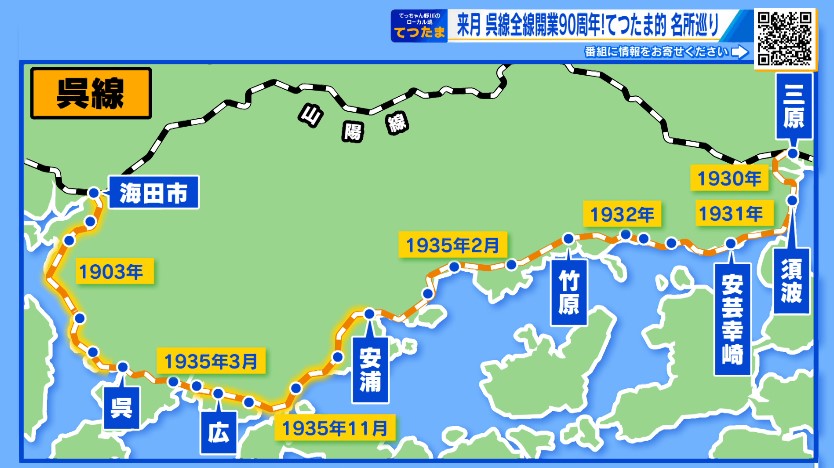 では今日なぜ三原駅にやってきたかといいますと、その呉線がこの11月で全線開通90年を迎えると言うことで、おめでとうございます。ねえ、歴史がある路線ですね」