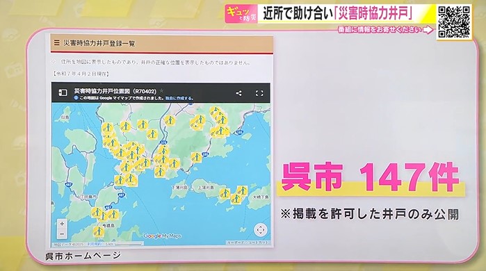 県内では西日本豪雨で大きな被害を受けた呉市で147件の井戸が登録されていて、平常時から市のホームぺージで井戸の位置を示したマップが公開されています。
