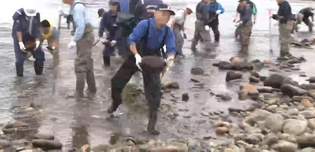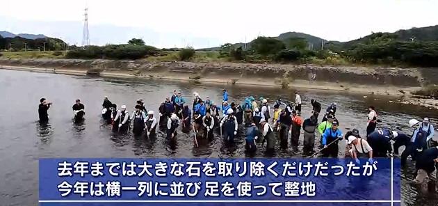 「みなさん一斉に川の中に入っていって、すでに石を外に投げ出している方もいますね」