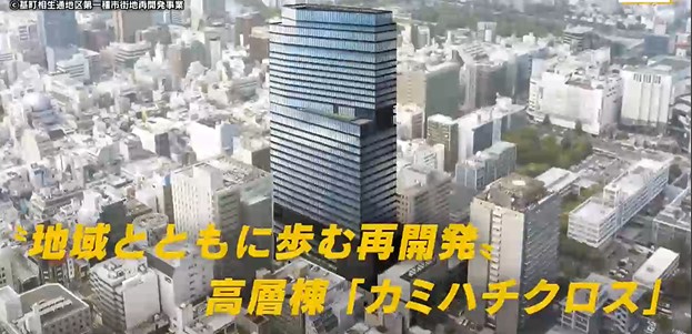 “地域とともに歩む再開発”という強い思いを込め「カミハチクロス」と名付けられた高層棟。