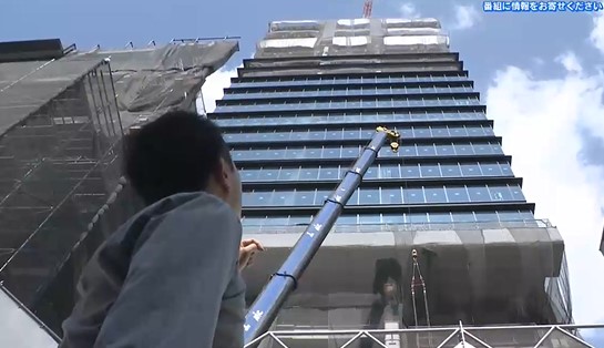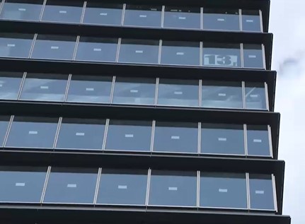 ガラス張りですね。ガラスの一角にはフロアの目安といいますか、外から見ても8階、13階というようにある程度の階数を刻んで、ここがどの高さだよというのが外からみてもわかるようになっています。