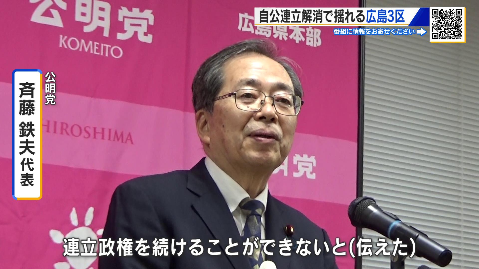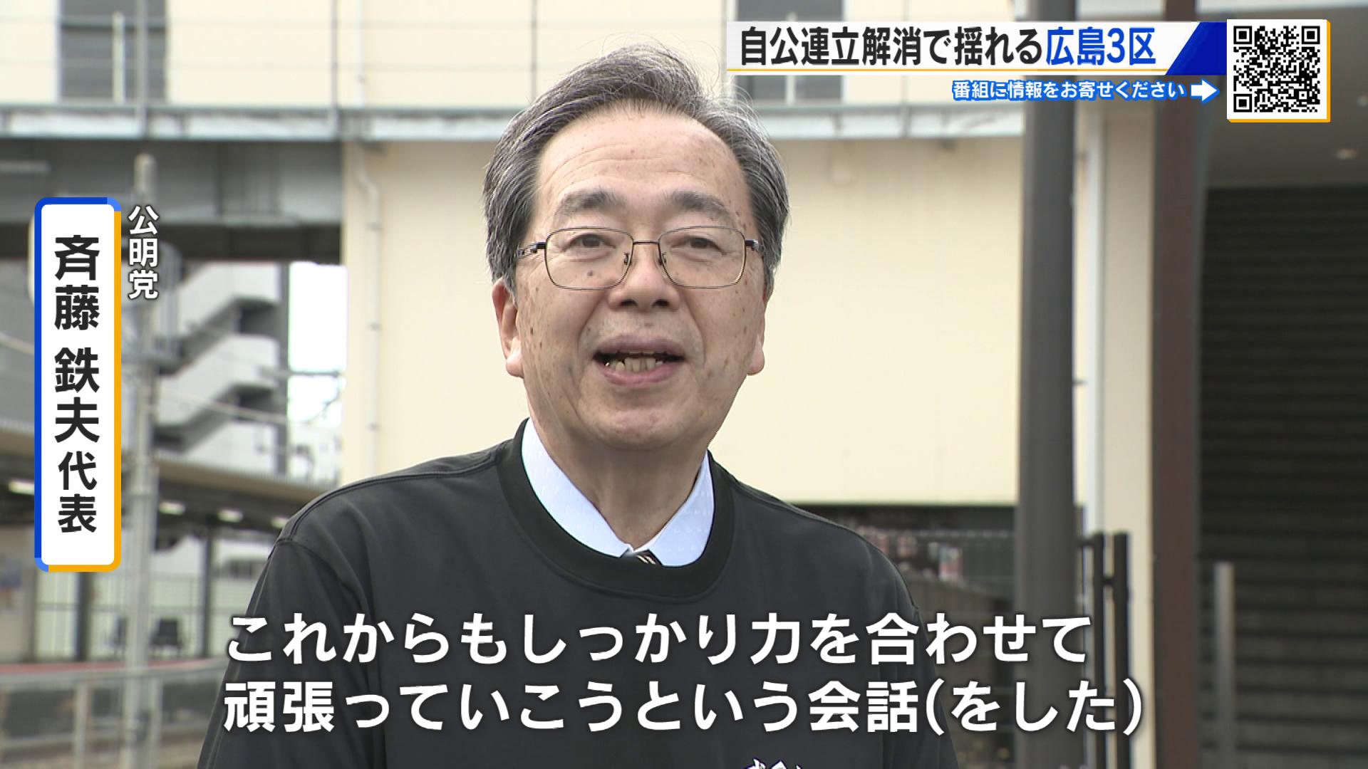 この週末、自民党と公明党が連立を解消して以降初めて衆議院・広島3区選出で公明党の斉藤代表が地元に戻り、与党として選挙協力をしていた自民党の石橋衆議院議員と地域の行事で対面しました。
