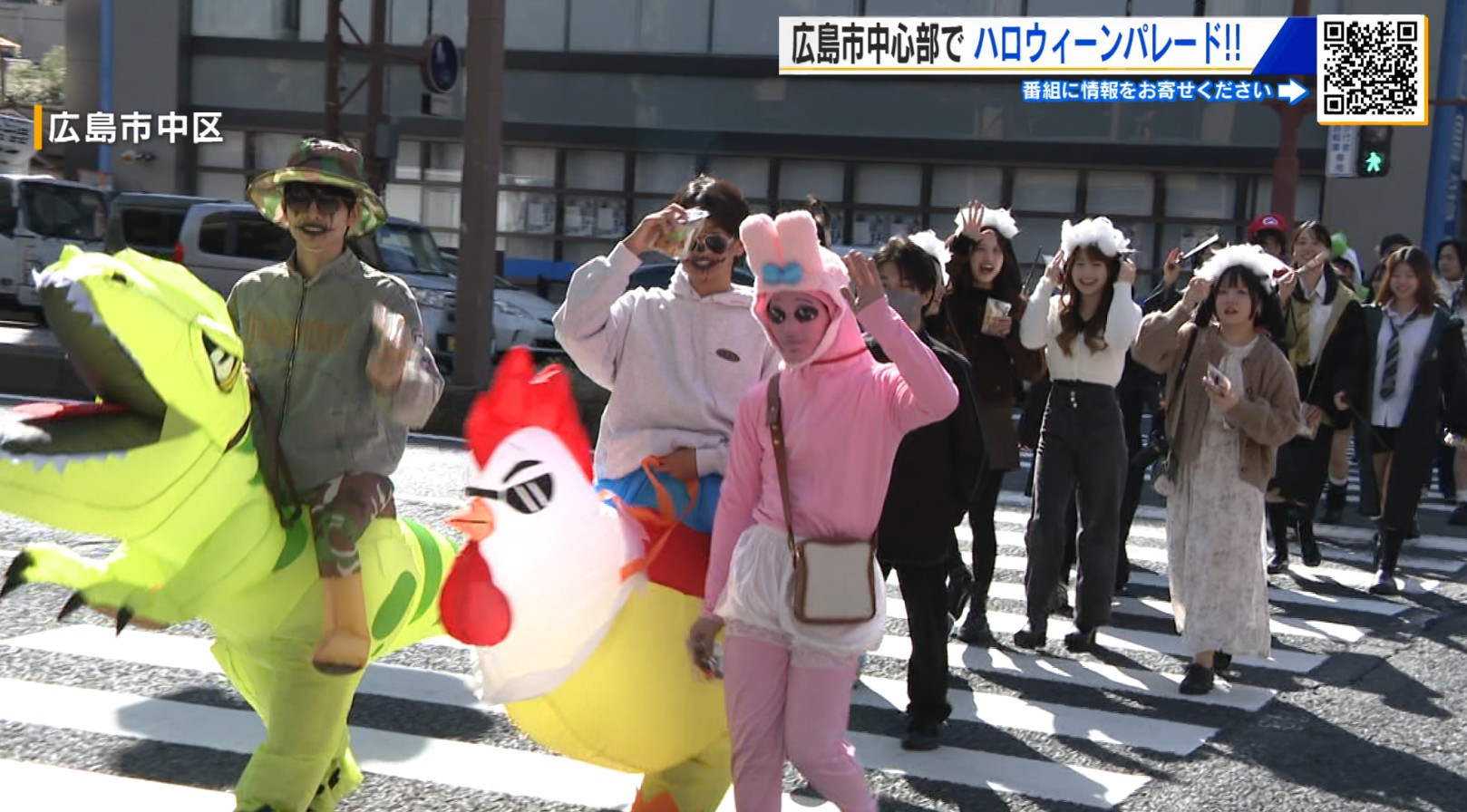 広島の街に突如現れた、横断歩道を渡るとても目を引くカラフルな一行。