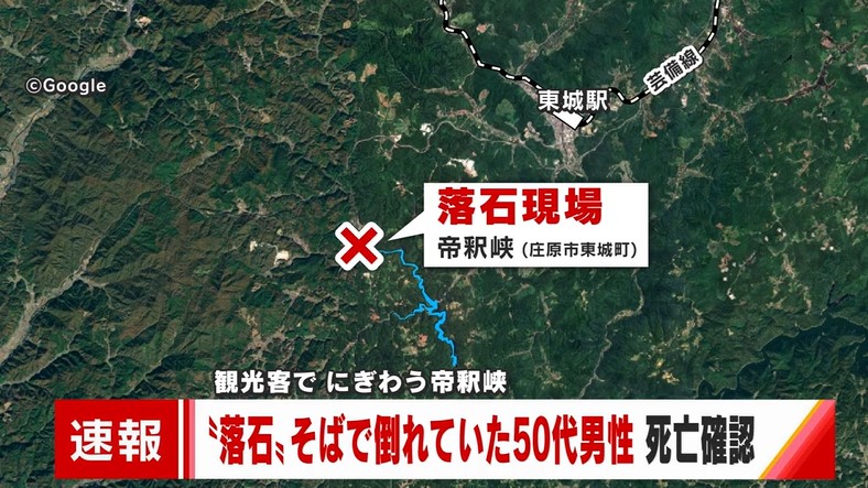 観光客でにぎわう庄原市の帝釈峡で落石による死亡事故の可能性です。
