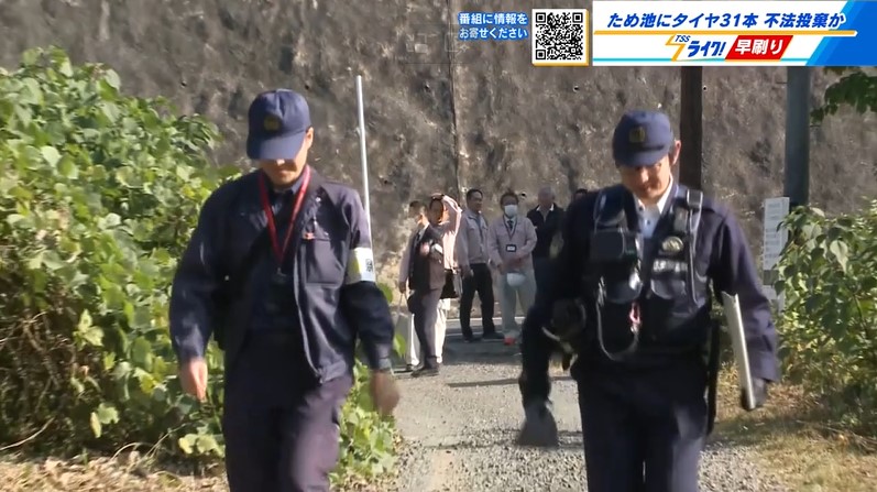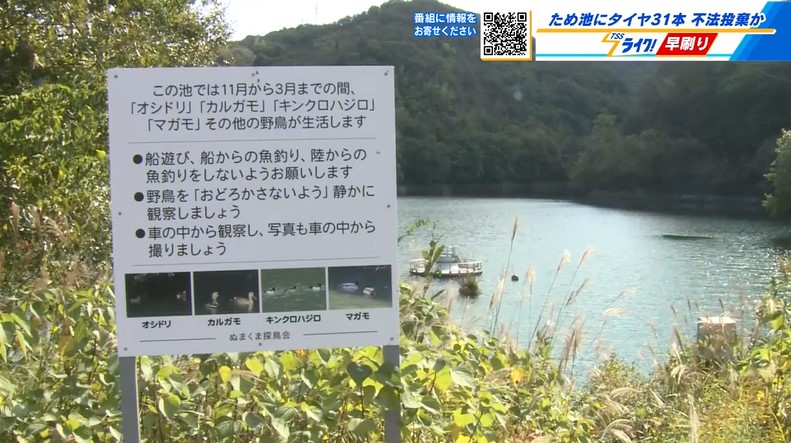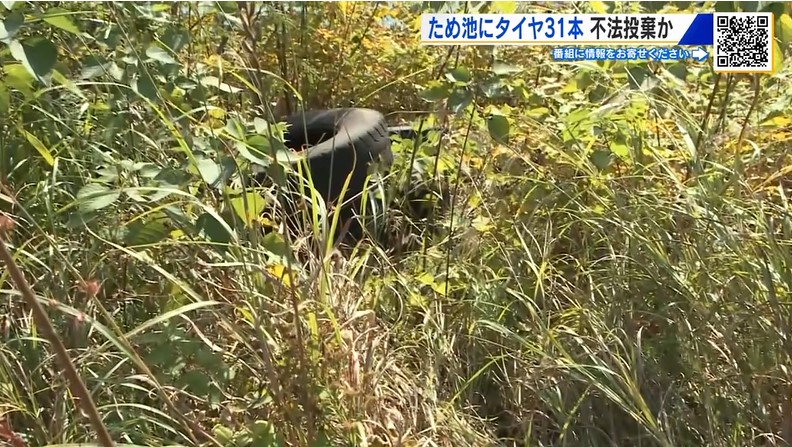 福山市にある「ため池」に複数のタイヤが不法投棄されているのが見つかり、市は、きょう警察とともに現地を確認しました。