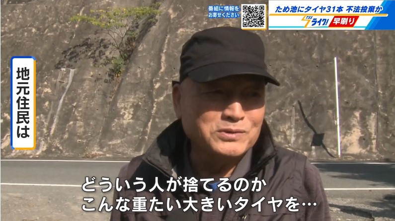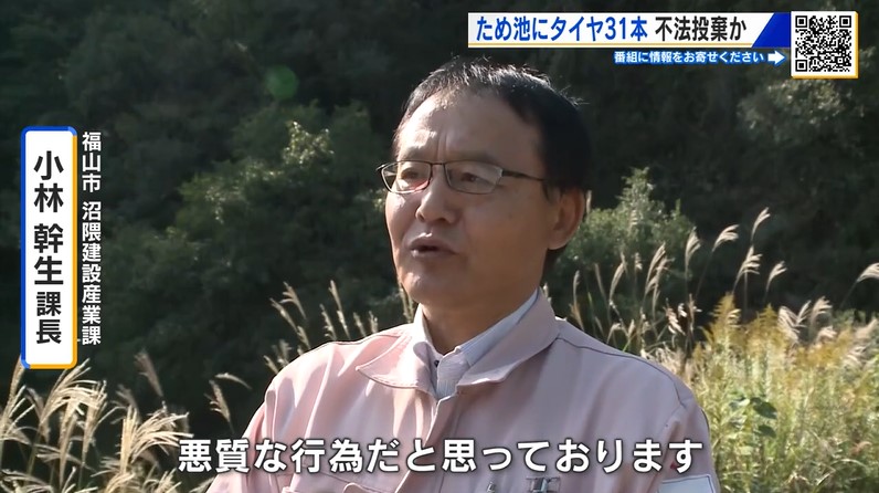 福山の農業用ため池に廃タイヤ31本が不法投棄 警察と市が現地調査 近隣住民から不安の声も