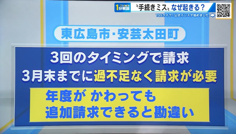 県の担当者によりますと、今回の東広島市と安芸太田町のケースでは交付金を請求するタイミングは、4月・8月・3月の3回で3月末までに過不足なく請求しないといけないんですが、数字が確定するのは年度末なので、年度がかわったあとに追加で請求できると勘違いしていた。