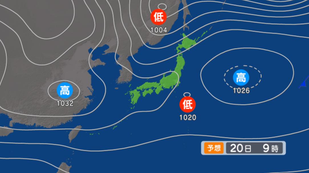 11/20(木)は冬型の気圧配置が解消されて、広く高気圧のエリアになるでしょう。