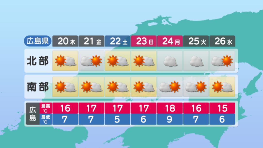 【広島の天気】11/20(木)は晴天広がる 冬型解消も朝の冷え込みはしっかり…