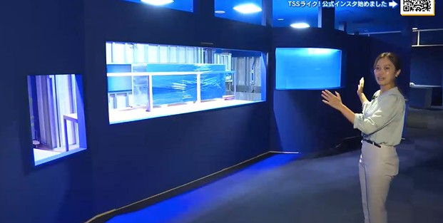 「このように水族館らしい丸い窓もありますけれども、全体の雰囲気をつくっている青というのは、以前のマリホ水族館にあわせて採用しているそうです。こちららがメインの水槽ということで3面ありますが、一体、どんな魚が入るのでしょうか」