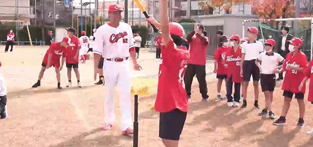 一方、広島市西区の庚午小学校では、子どもたちに混じって授業を受けるカープ・森浦大輔投手たちの姿が…子供たちは選手たちと一緒に環境やエネルギーについて学んだあと、校庭で選手に教わりながらバッティングに挑戦し、野球の楽しさを感じていました。