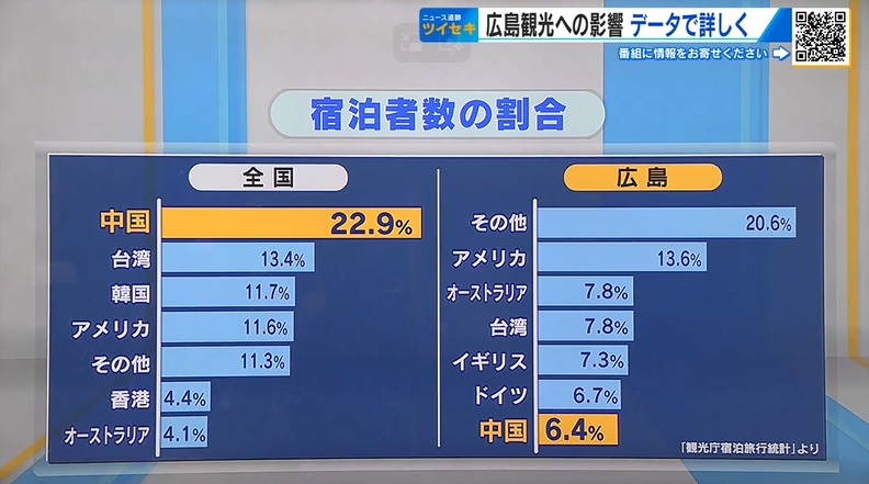 一方で、広島県に宿泊した外国人は「欧米人」が多く、中国からの宿泊客は「6.4%」に留まっています。