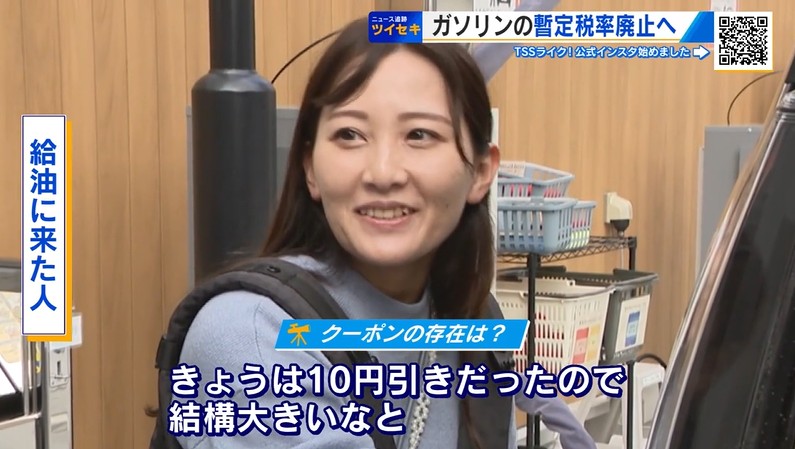 「(Qきょうは?)クーポン利用して1リットル当たり151円。(前回は)160円くらいだったのでこのくらいだったら助かる」