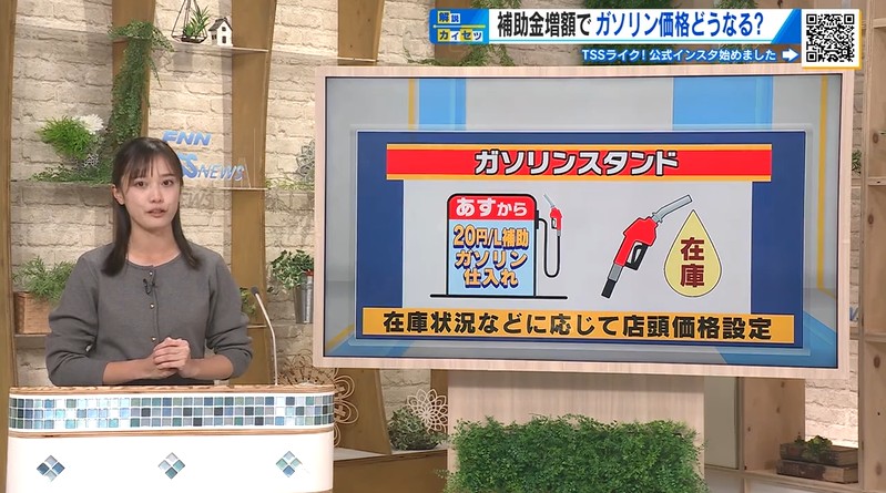 どういうことかというと…まず、ガソリンスタンドは明日から1リットル当たり20円の補助が反映された額で仕入れられますが、多くの店舗では補助金が増える前の高い価格で仕入れた在庫がまだ残っているんです。