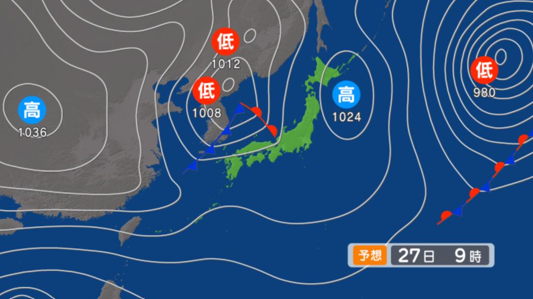 27日(木)は西から近づく前線が夕方以降、県内を通過していく見込みで、天気は下り坂でしょう。また、夕方から風が強まりそうです。