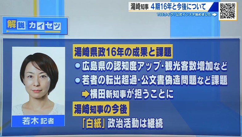 そして、湯崎知事自身の今後は「白紙」と話しています。一方で政治活動は続けると明言しています。先日、ライクに生出演をされた際にも、これからどうするんですか?と質問しましたら、「自分の気持ちがまだわからない」とも話されていましたけれども、今後、どのような形で広島県の発展に関わっていくのか注目されます。