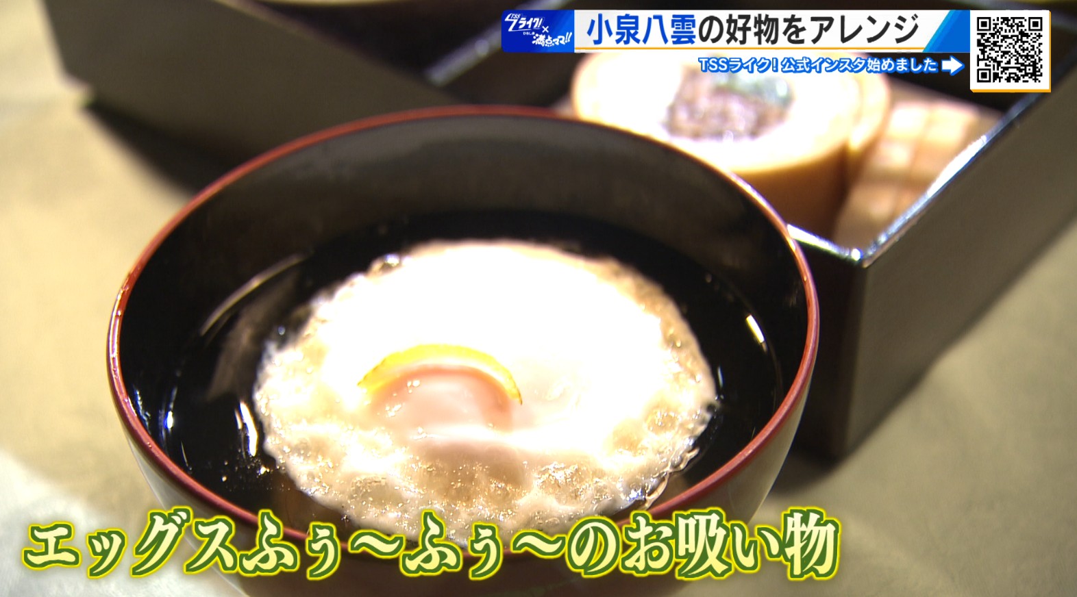 八雲の好物、目玉焼きをお吸い物にアレンジ!その目玉焼きの下にこちらも好物だったというパンを入れた新感覚のメニューです!そのお味は?