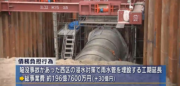 このほか市は債務負担行為として陥没事故があった西区の浸水対策で雨水管を埋設する工期を2030年度まで延長するとしていて、総事業費が、およそ196億7000万円に膨らむと示しました。