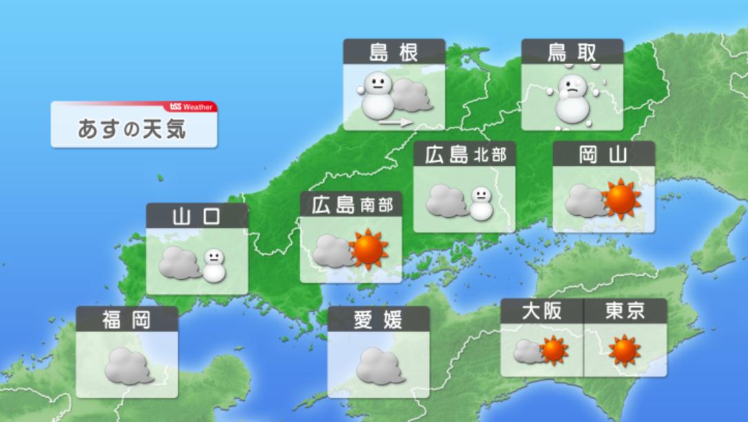 寒気の影響が残り、週末までは連日、中国山地の標高の高いエリアでは、明け方に雪が降るでしょう。また冬らしい寒さは週末まで続き、日曜日の日中には、ようやく寒の緩みを感じられそうです。