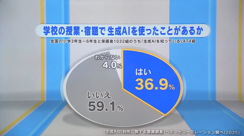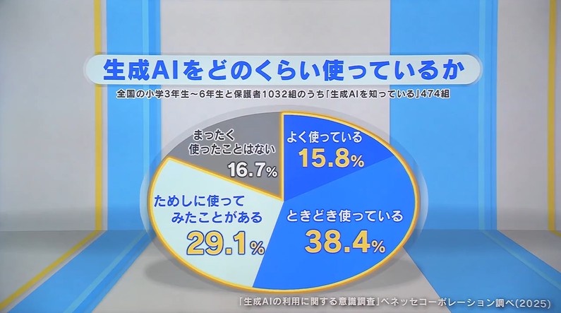 全国の小学3年から6年の児童とその保護者およそ1000組に行ったアンケート結果ですが…「生成AIを知っている」と答えたおよそ470組のうち8割以上が、利用経験があると回答しています。