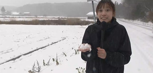 「広島県北広島町にあるこちらの温度計は氷点下3度となっています。本格的な冬がやってきました。こちらの雪を触ってみると、かなり細かくて、さらさらとしています。当たり前ですが、冷たいです。寒い」