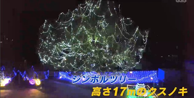 また、高さ17メートルのクスノキも、近くにある遊園地「みろくの里」の協力で彩られていて、およそ9万球の明かりがまちを温かく照らします。