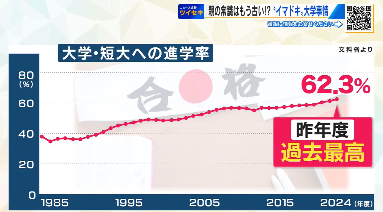 文部科学省によると昨年度の進学率は統計史上最高の62.3%を記録しています。
