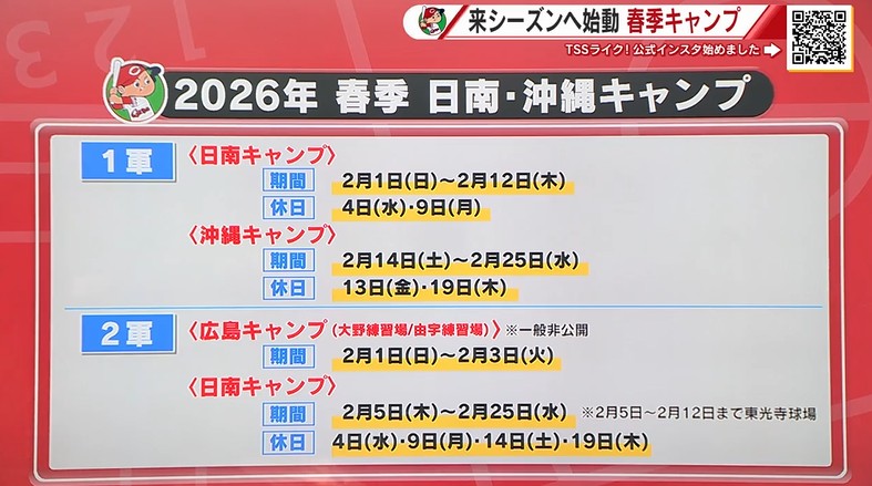 カープは来年2月に行われる春季キャンプの日程を発表しました。