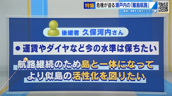 VTRに出ていた似島汽船・浜本さんの後継者・久保河内さんは島民のためにも運賃やダイヤなどいまの水準は保ちたい、とした上で「航路継続のため島と一体になって似島の活性化を図りたい」と話していました。