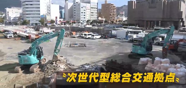 「JR呉駅前です。再開発が着々と進んでいます。左側に呉駅がありますが、その前のバスロータリーもかなり姿を変えてきています。そして、あちらフェンスの隙間から銀色の手すりが見えますが、おそらくここに架かっていた歩道橋だと思います。そういったものを取り外して、大がかりな、生まれ変わるような再開発が着々と進んでいます」