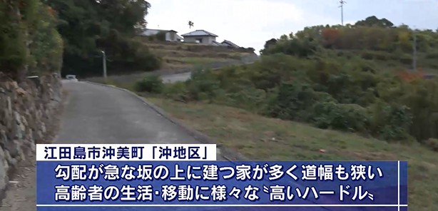 特に沖美町の「沖地区」は65歳以上の高齢化率52.5%と高い上、勾配が急な坂の上に建つ家が多く道幅も狭いことから高齢者の生活・移動には様々な“高いハードル”があります。