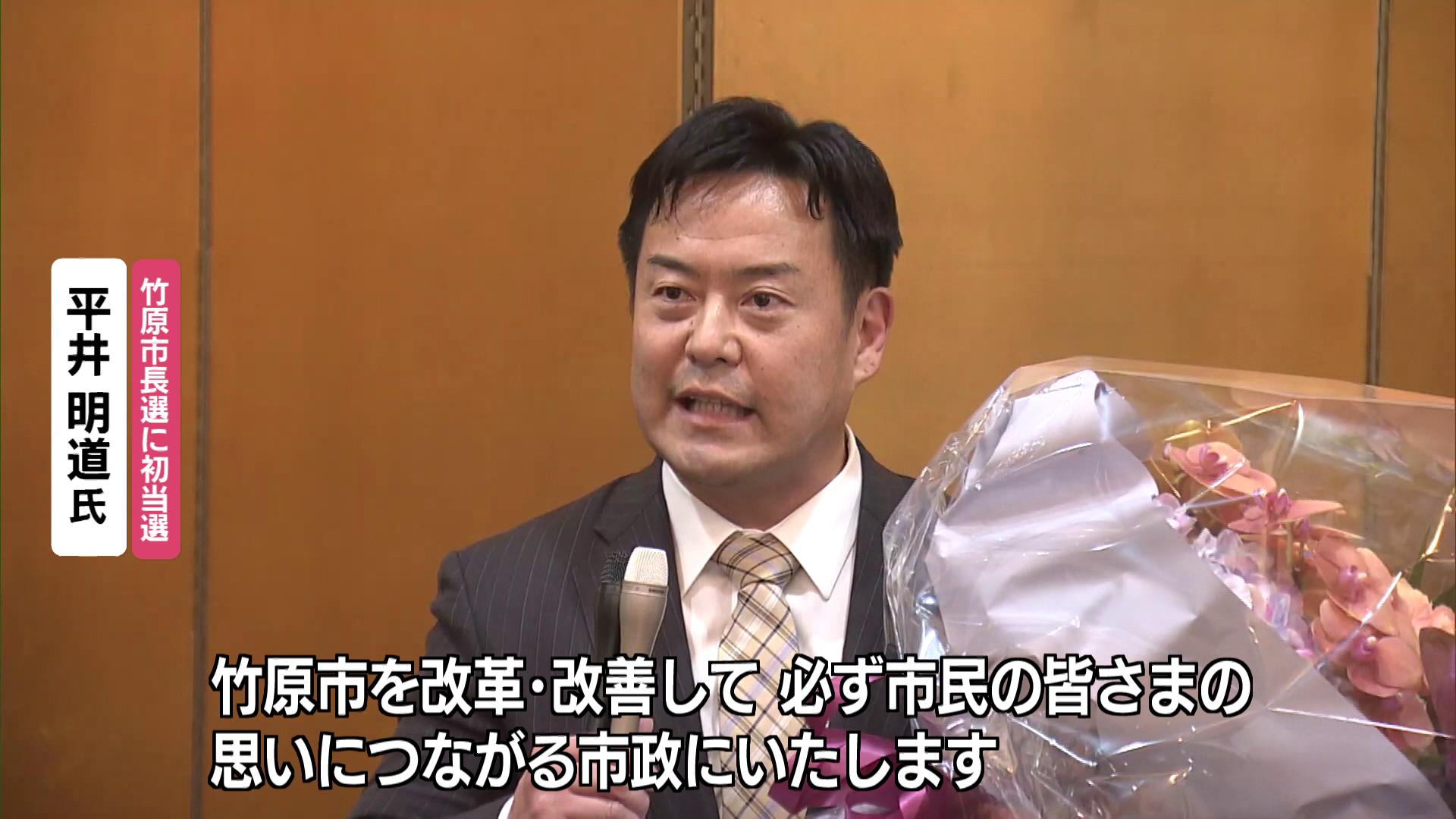 21日、投開票された竹原市長選挙は無所属・新人で元市議の平井明道(ひらい あきみち)氏(46)が3選を目指した現職の今栄敏彦(いまえ としひこ)氏(65)との一騎打ちを制し、初当選を果たしました。