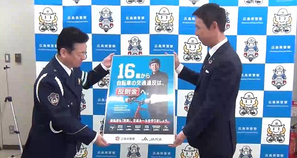 来年度から、自転車の交通違反に「青切符」が導入され、16歳以上の運転手に反則金が課されることを広く知ってもらおうとJA共済連広島が広島県警に啓発ポスターを寄贈しました。