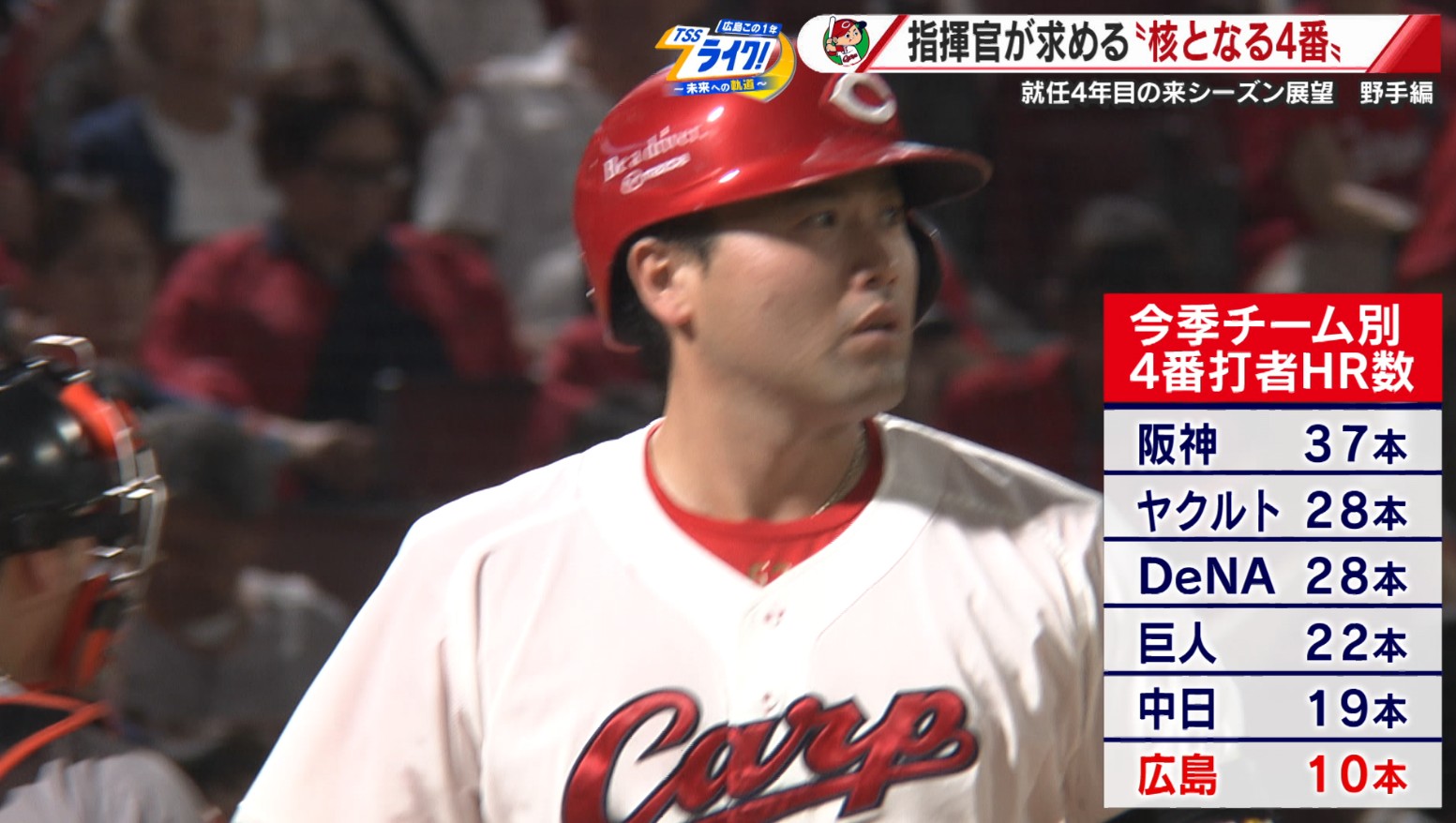 今シーズン、各チームの4番打者のホームラン数を比較すると、リーグ最少の数字に終わったカープ。