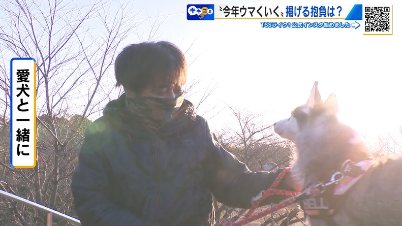 「(犬が)なんかしゃべっていますね…しゃべっているかもしれませんね、なんか抱負を(なんて言っていそうですかね)今年はいっぱい飯食いたいと言っているんじゃないですか。仕事は営業です。物を売るのでなかなか今物が売れないので、特に去年はしんどかったので、仕事が順調じゃないと家族がいるんで、犬もいるので。結構この人も食うので…」