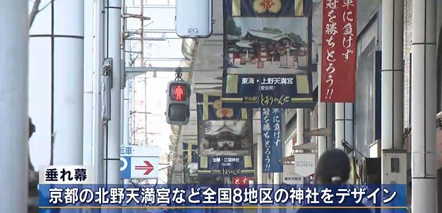 垂れ幕には、京都の北野天満宮をはじめ、全国8つの地区の代表的な神社がデザインされています。