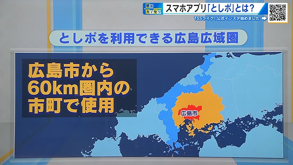 広島市を中心とした60キロ圏内の島根県や山口県の一部が含まれる広域圏が使用範囲で、地域で得たポイントを同じ地域で使うことで、経済を循環させる仕組みになっています。