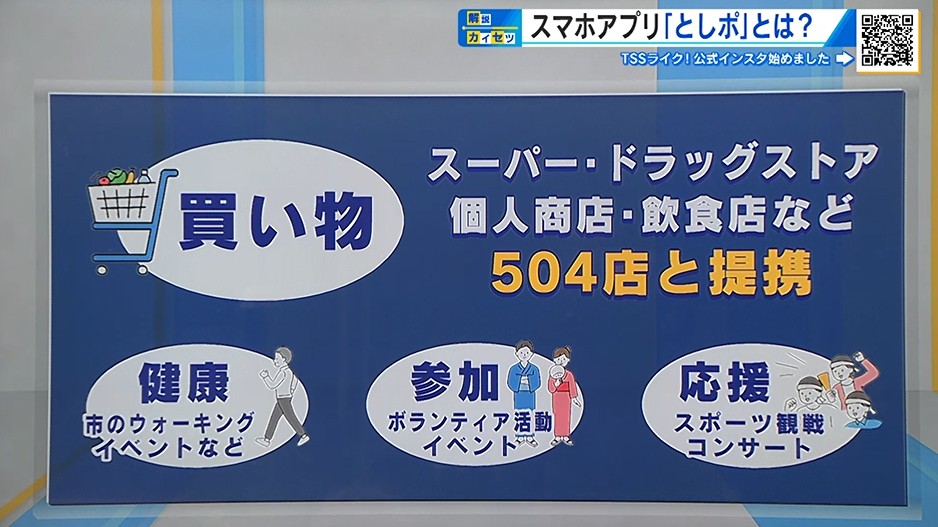 例えば、提携する大手スーパーやドラッグストアなど504店で買い物に使えるほかボランティア活動をしたり、広島市が開催するウォーキングイベントへの参加。