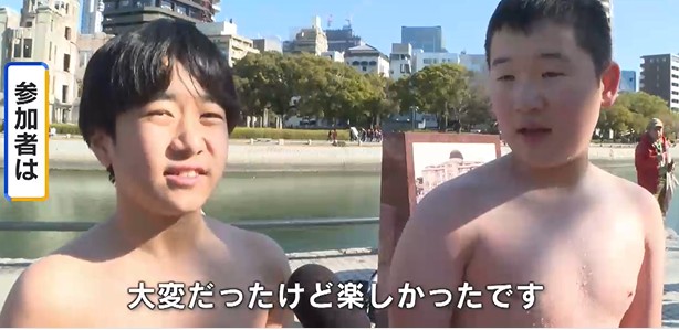 強い寒波に見舞われた三連休最終日の12日、広島市中心部を流れる元安川で、新春の恒例行事、「寒中水泳」が行われました。