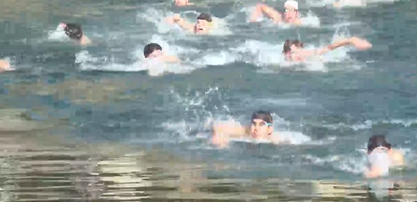 この「寒中水泳」は、毎年「成人の日」に、広島遊泳同志会が、寒稽古として行っています。