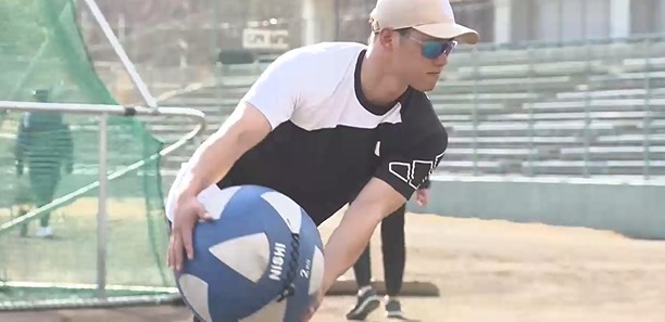 キャッチボールやノックを受けた後は軸足に体重を乗せる意識でメディシンボールを使ったトレーニングを行いました。