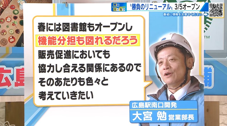 そしてエールエールとミナモアの関係について、広島駅南口開発の大宮さんに聞きました。大宮さんは「ミナモアはあれだけたくさん集客しているので、エールエールにも来てほしいし相互に協力できることがあると思う。春には図書館もオープンし機能分担も図れるだろう。販売促進においても協力し合える関係にあるので、そのあたりも色々と考えていきたい」と話していました。