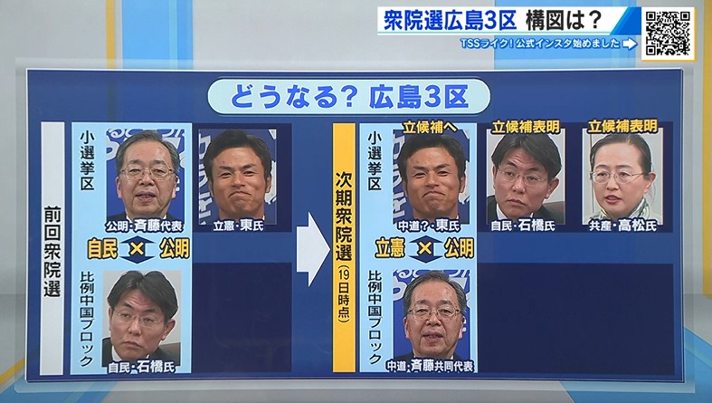 「自公連立」の解消と「中道改革連合」の結成を踏まえると公明党の斉藤代表は比例に転じ、小選挙区は、自民党の石橋氏。立憲民主党の東氏。そして、19日、立候補を表明した日本共産党の高松史子氏という顔ぶれが現時点では予定されています。