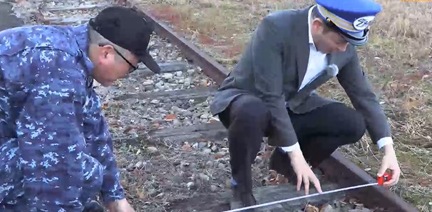 JRの主だった在来線で使われている1067ミリから、新幹線や広島電鉄の1435ミリなんか、色々ありますけども、こちらはどうなんでしょうか?よっ。これはご覧ください。1m7cm。これは1067ミリのいわゆる狭軌。JRの主だった在来線の線路幅と判断していいんじゃないかと思います。わー、ちょっと狭軌がここを走っていたんです。