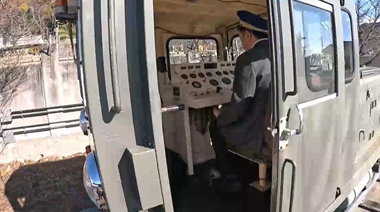 「おー、あ、そうか、こちら向きですね。普通は前方を向いてることが多い運転席ですけれども、これ横向きですね。いわゆる凸型の機関車なんかが、このタイプになっていることが多いですけれども。ですからこちらで操作をしながら、横を見て運転する感じなんですね。中は広いかと言われると広くはないですね。限られた空間の中にいろんなものが詰まっている、そんな感じがします。しっかり役に立っていたんだろうな、という感じがしますね」