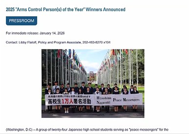 今回選ばれた賞はアメリカのシンクタンク「軍備管理協会」が軍縮や平和活動に貢献した個人・団体を表彰するもので、広島の高校生3人を含む「第28代 高校生平和大使」が選ばれました。