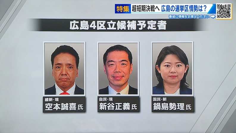 4区は、東広島市と呉市と、大票田がふたつあるわけですが、3人とも主な地盤が東広島市になります。自民党と、日本維新の会の調整が行われないまま、連立与党の現職同士の戦いに野党の新人が挑む構図となります。