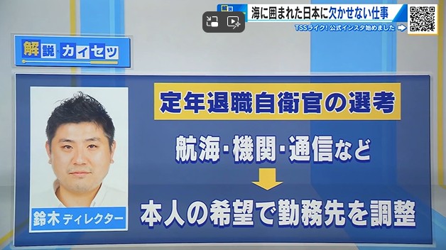 取材を続けている鈴木ディレクターによると、定年退職予定の自衛官の選考は海上保安庁全体で行われ、「航海」や「機関」、「通信」など「5職種」で船員を募り、本人の希望で勤務先が調整されています。